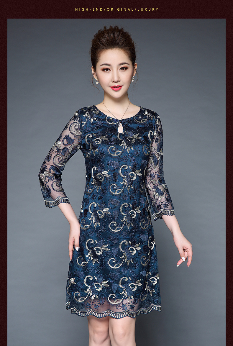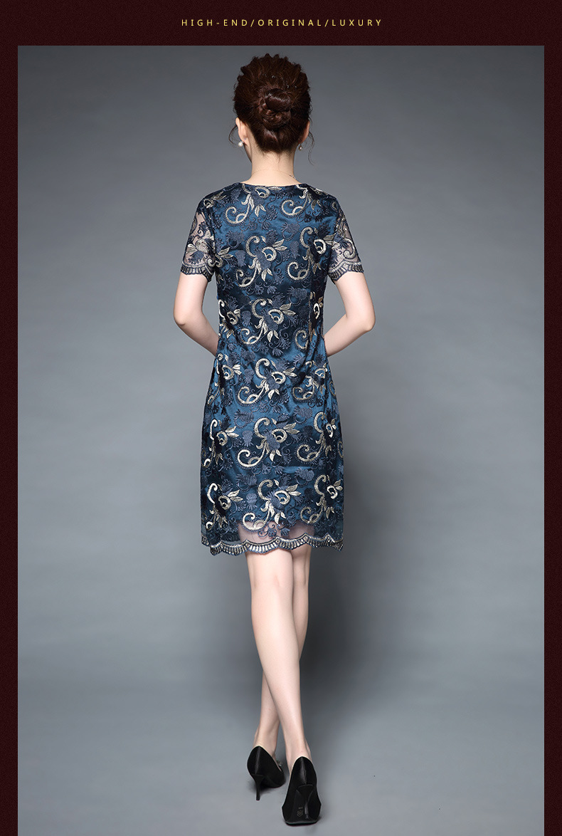 夏装新款女装重工刺绣精致圆领镂空旗袍扣修身显瘦短袖连衣裙 蓝色短袖 M