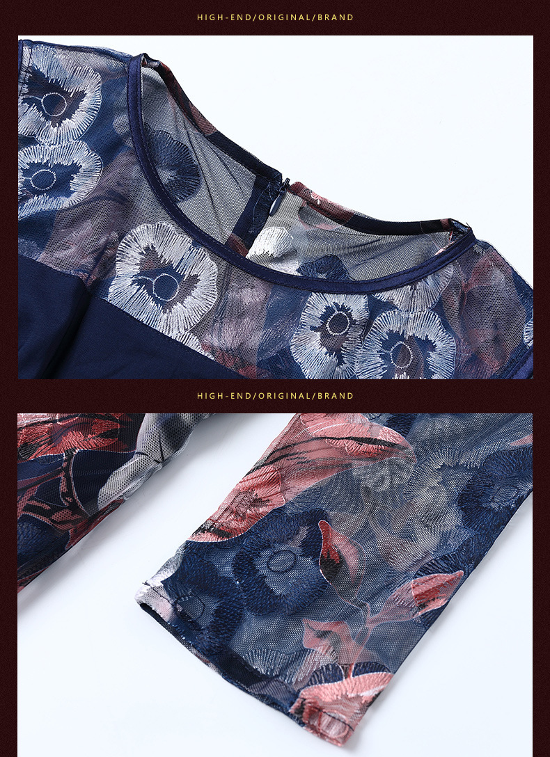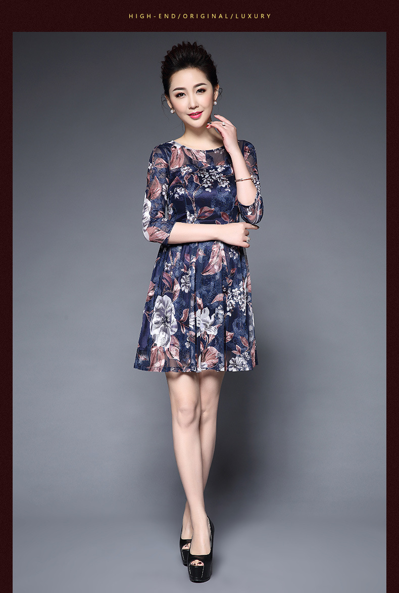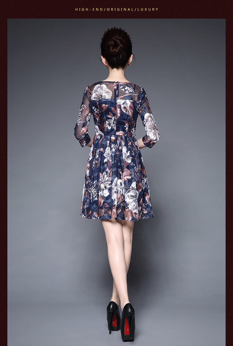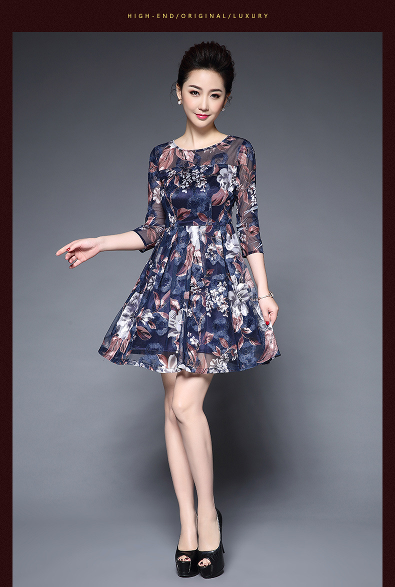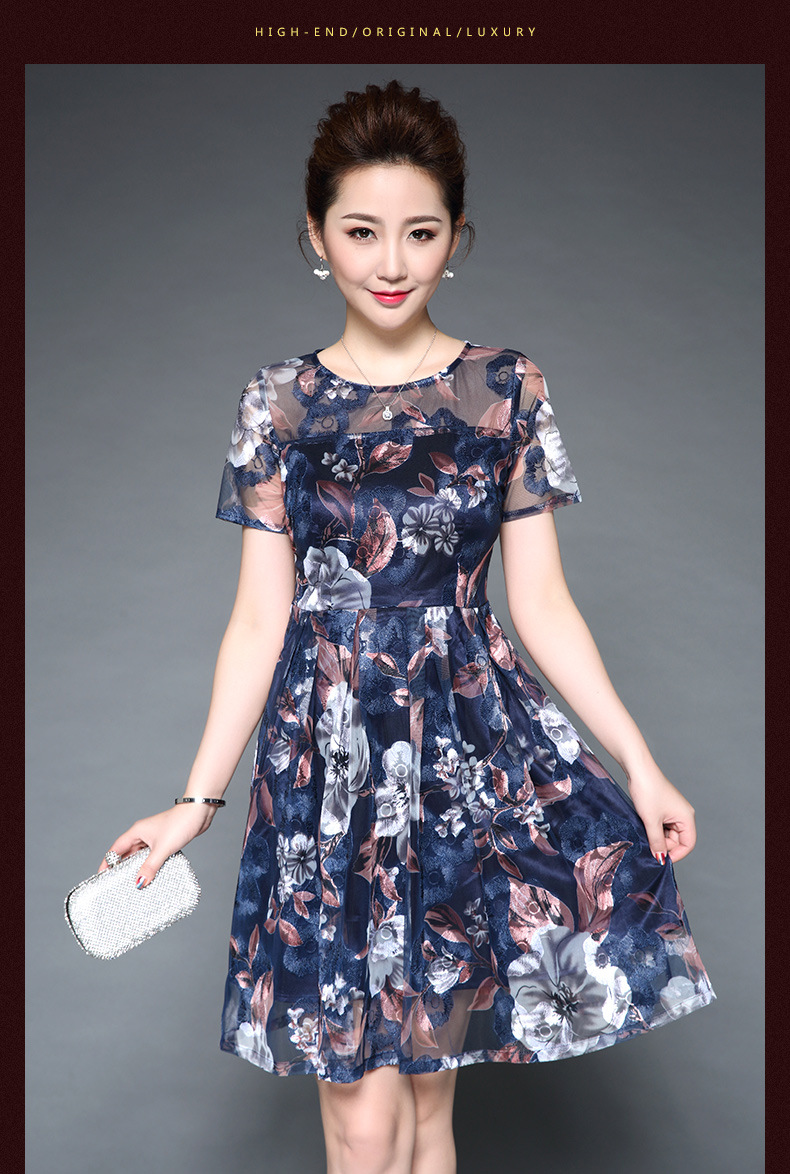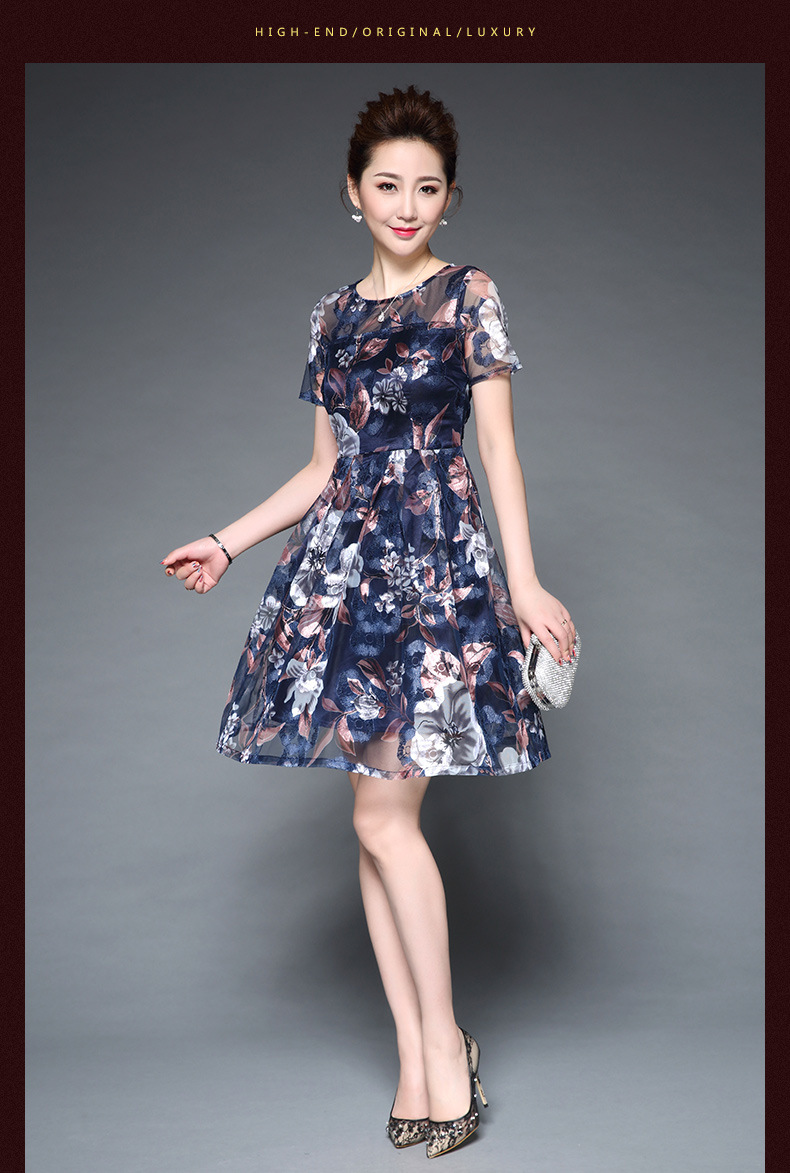 厂家直销新款中老年夏装气质网纱印花修身大摆短袖连衣裙女 蓝色短袖 M