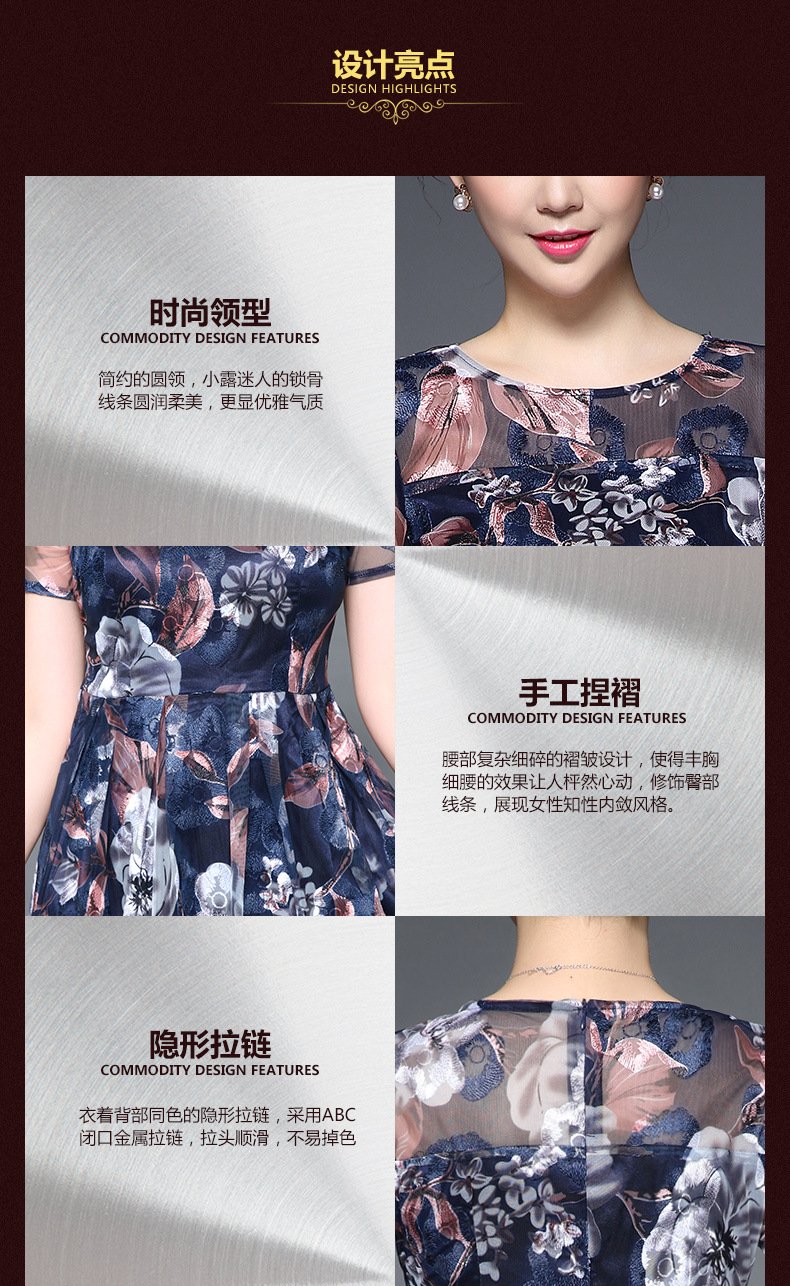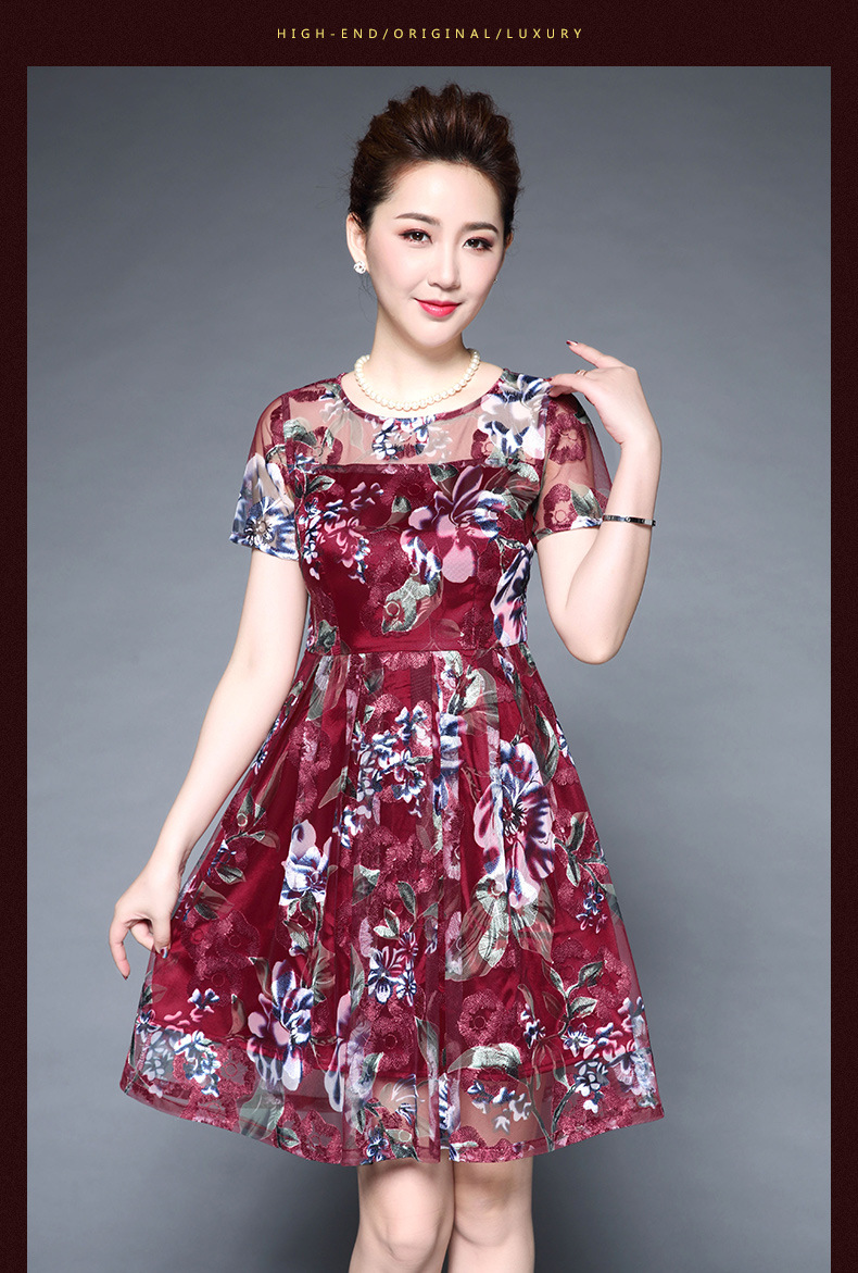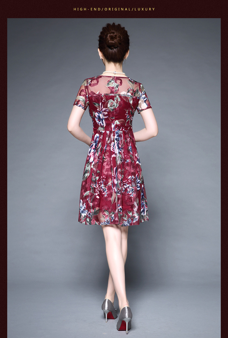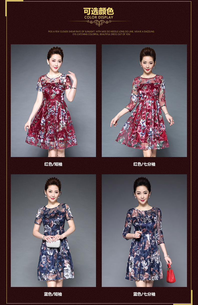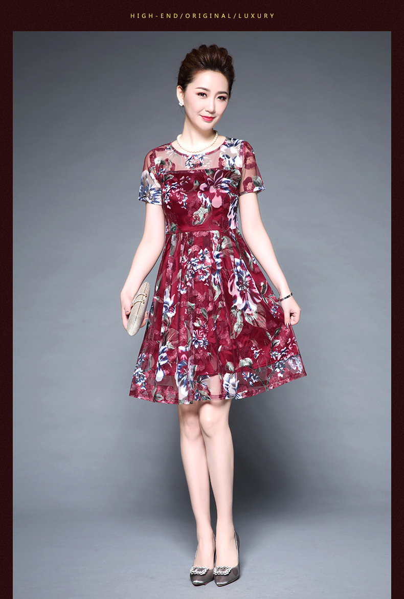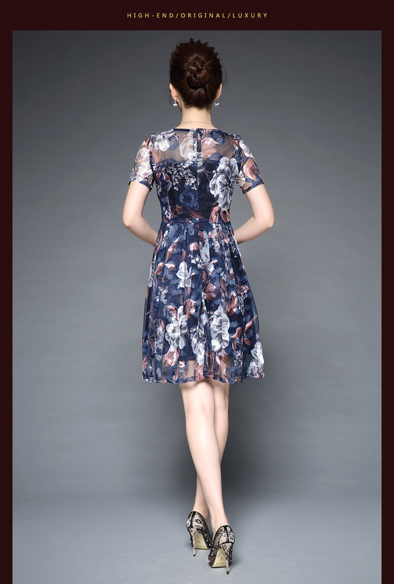 厂家直销款中老年夏装气质网纱印花修身大摆短袖连衣裙女