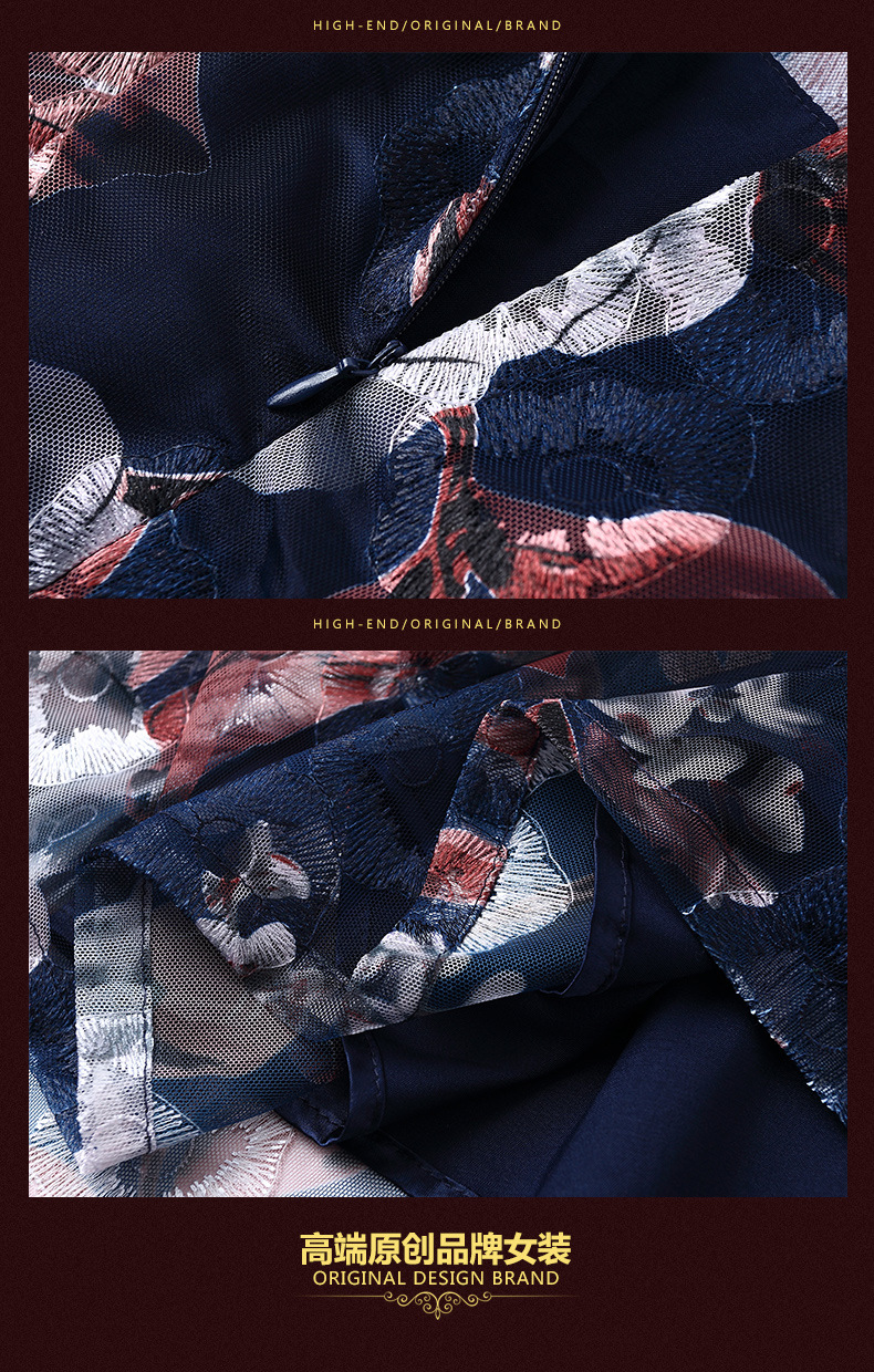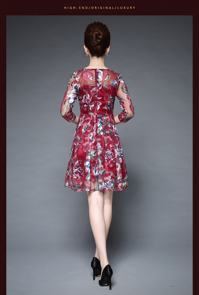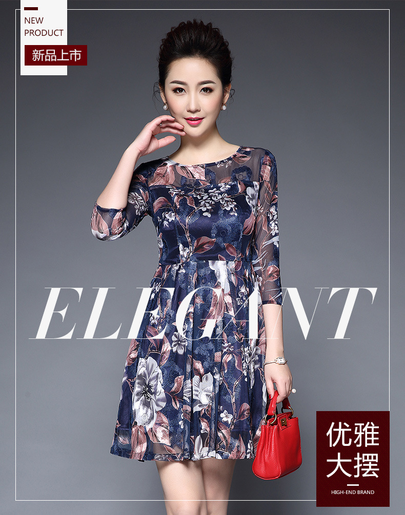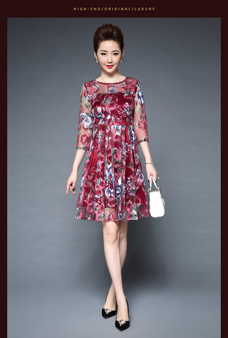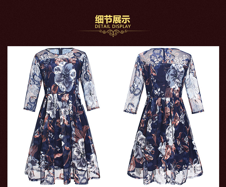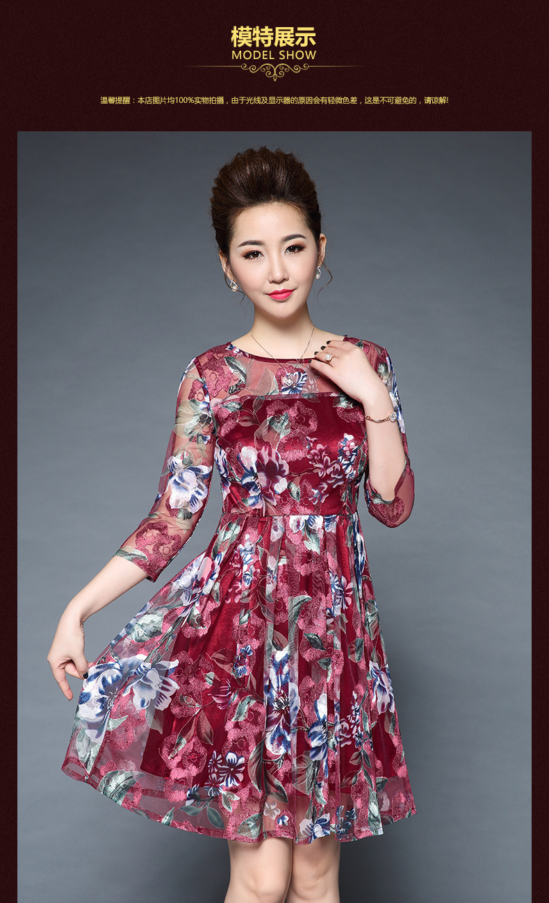 厂家直销款中老年夏装气质网纱印花修身大摆短袖连衣裙女