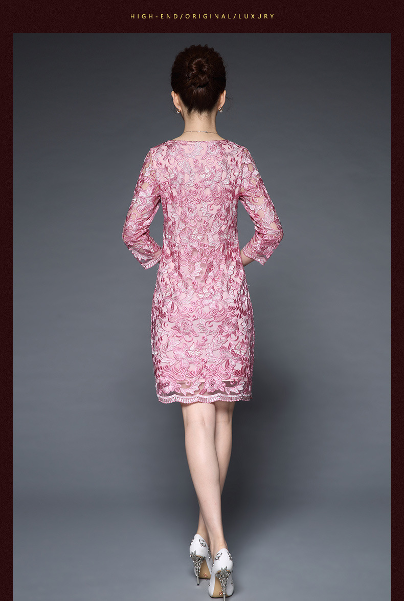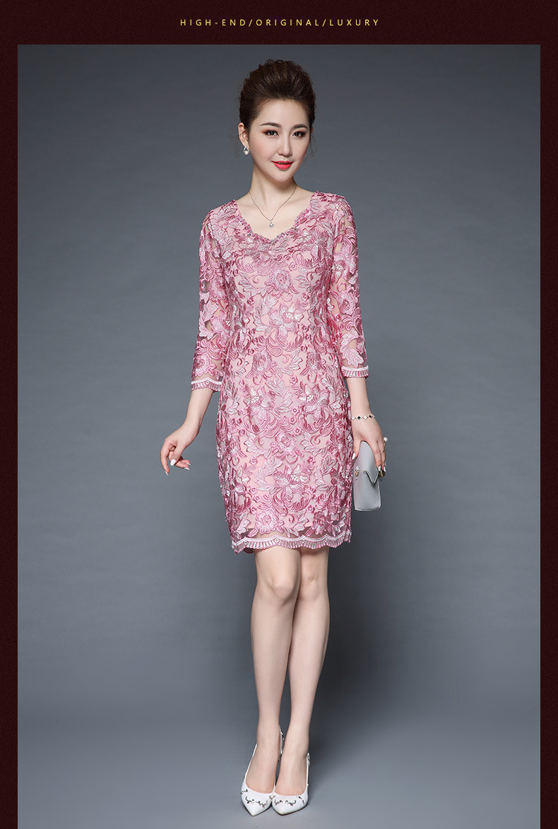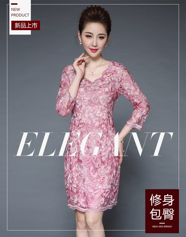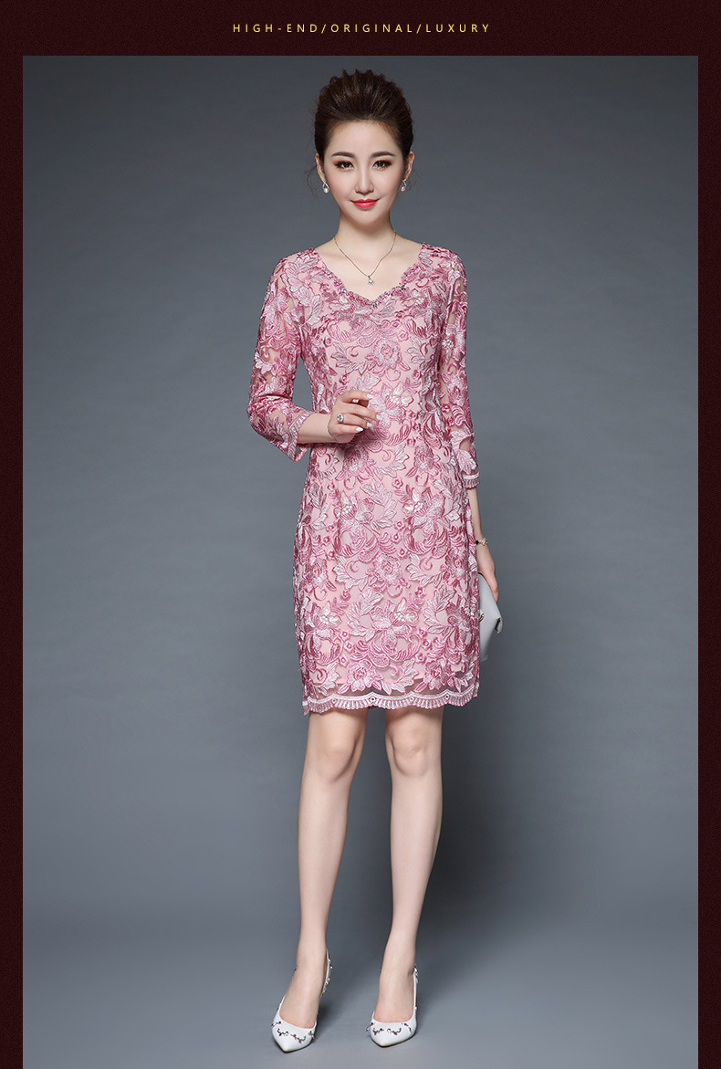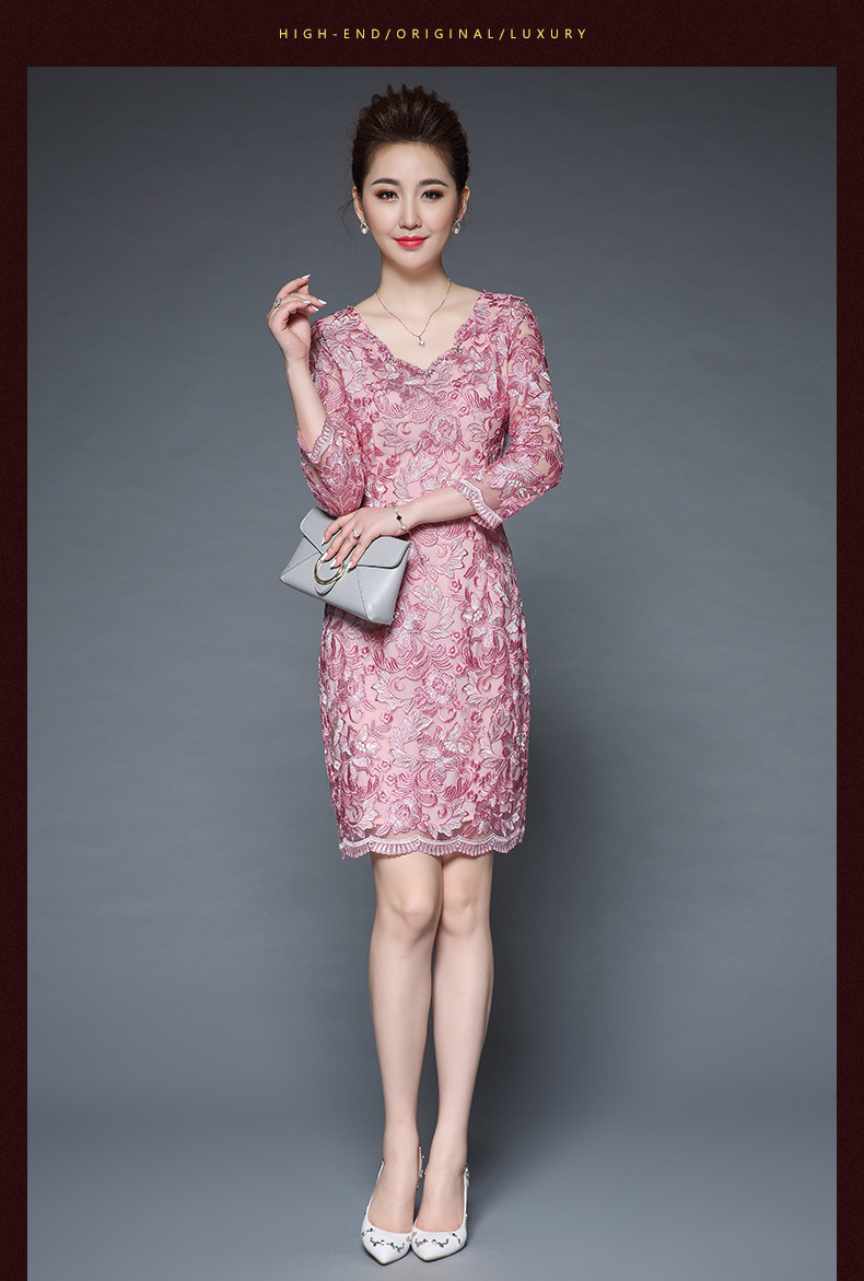 秋装新款女装名媛气质网纱刺绣性感V领钉珠修身显瘦七分袖连衣裙 粉色 M