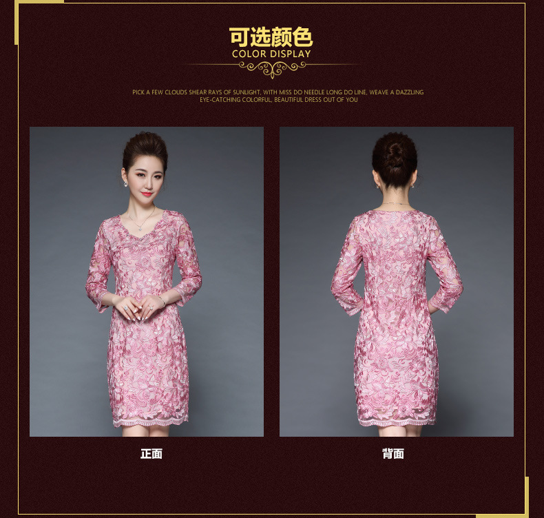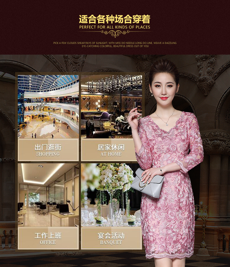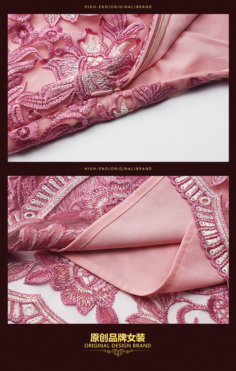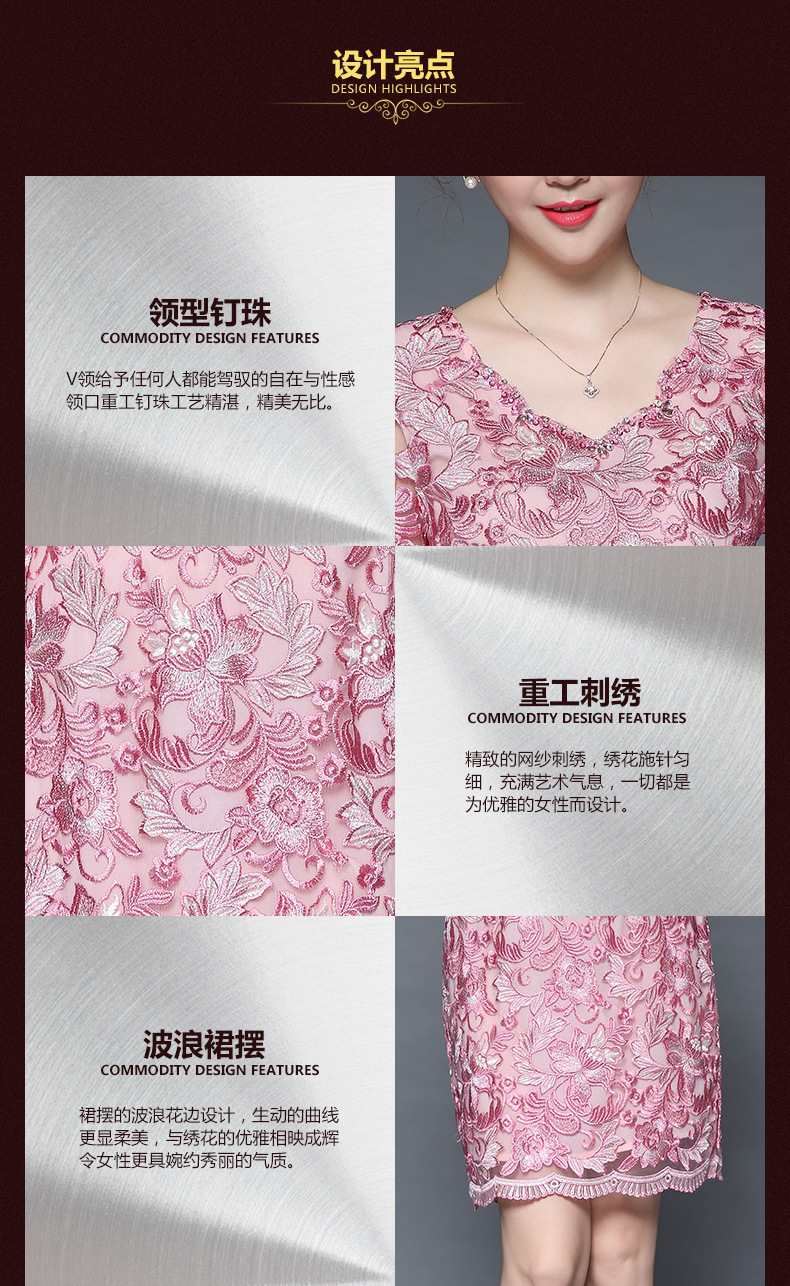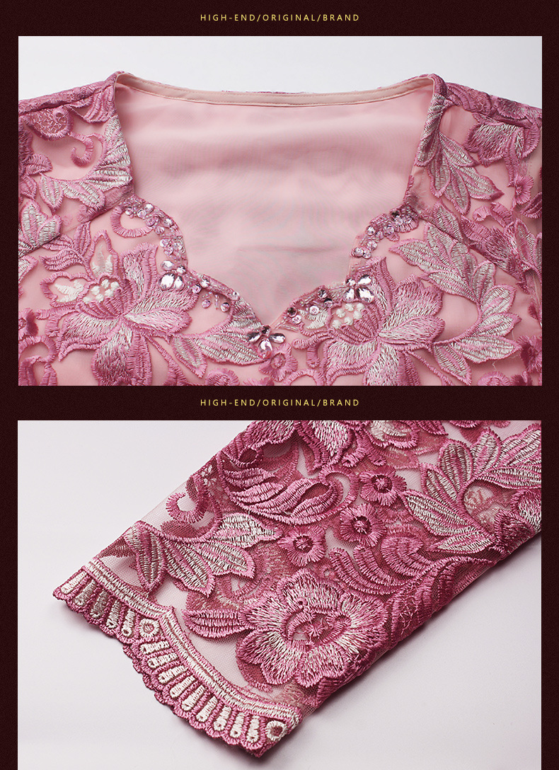 秋装新款女装名媛气质网纱刺绣性感V领钉珠修身显瘦七分袖连衣裙 粉色 M