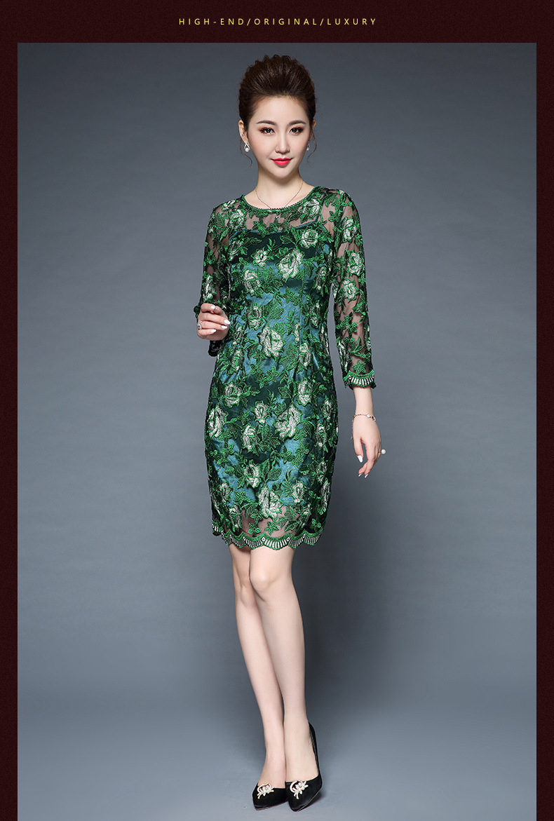 秋装新款女装网纱刺绣名媛气质精致圆领修身显瘦七分袖连衣裙 绿色 M