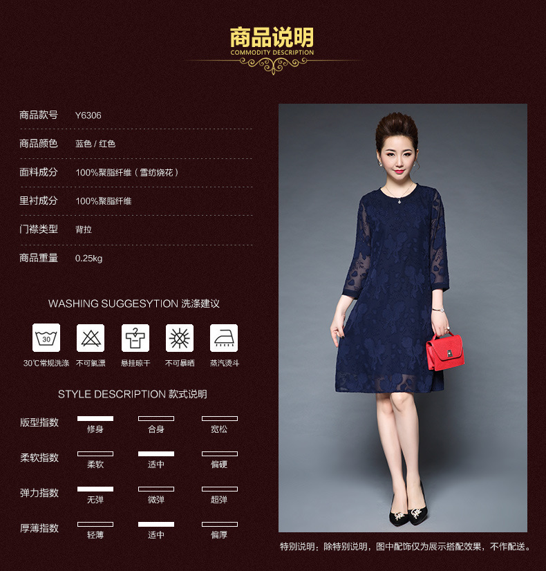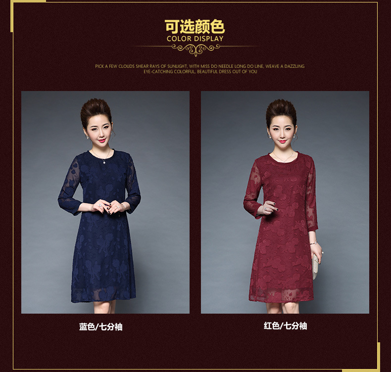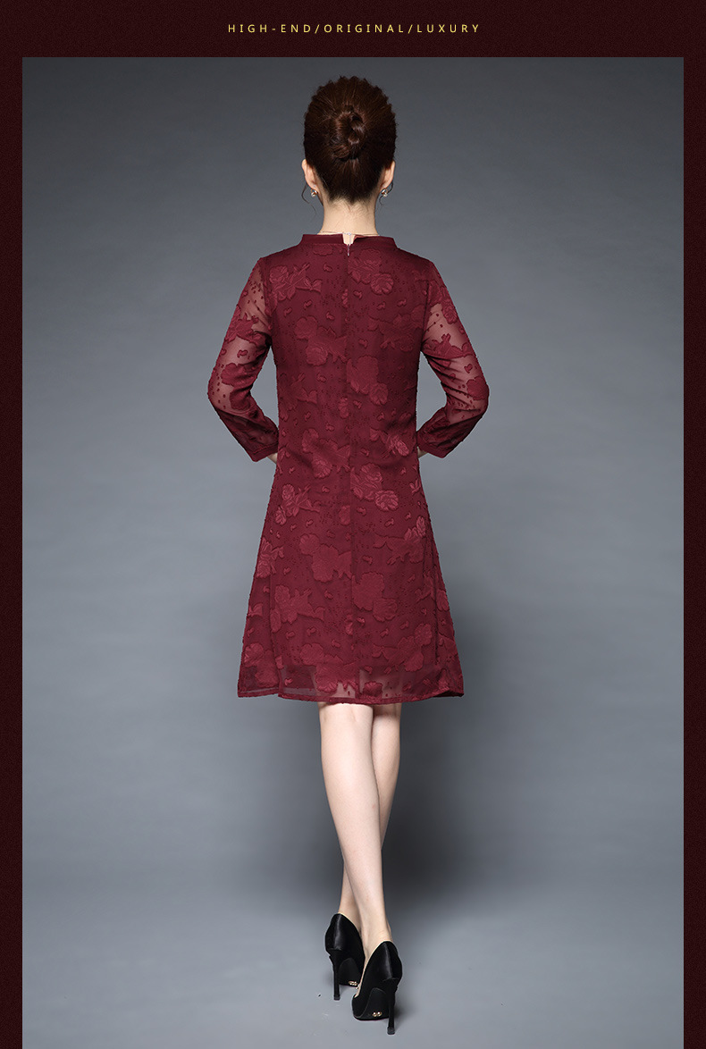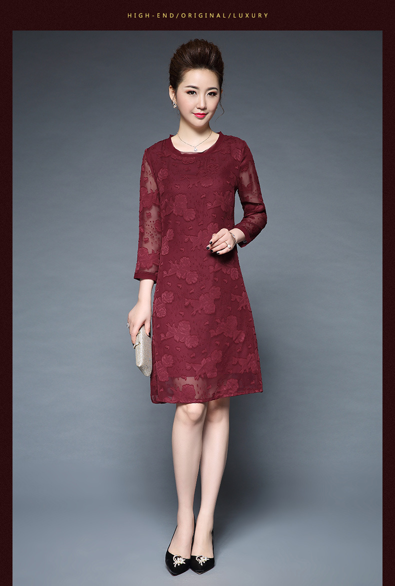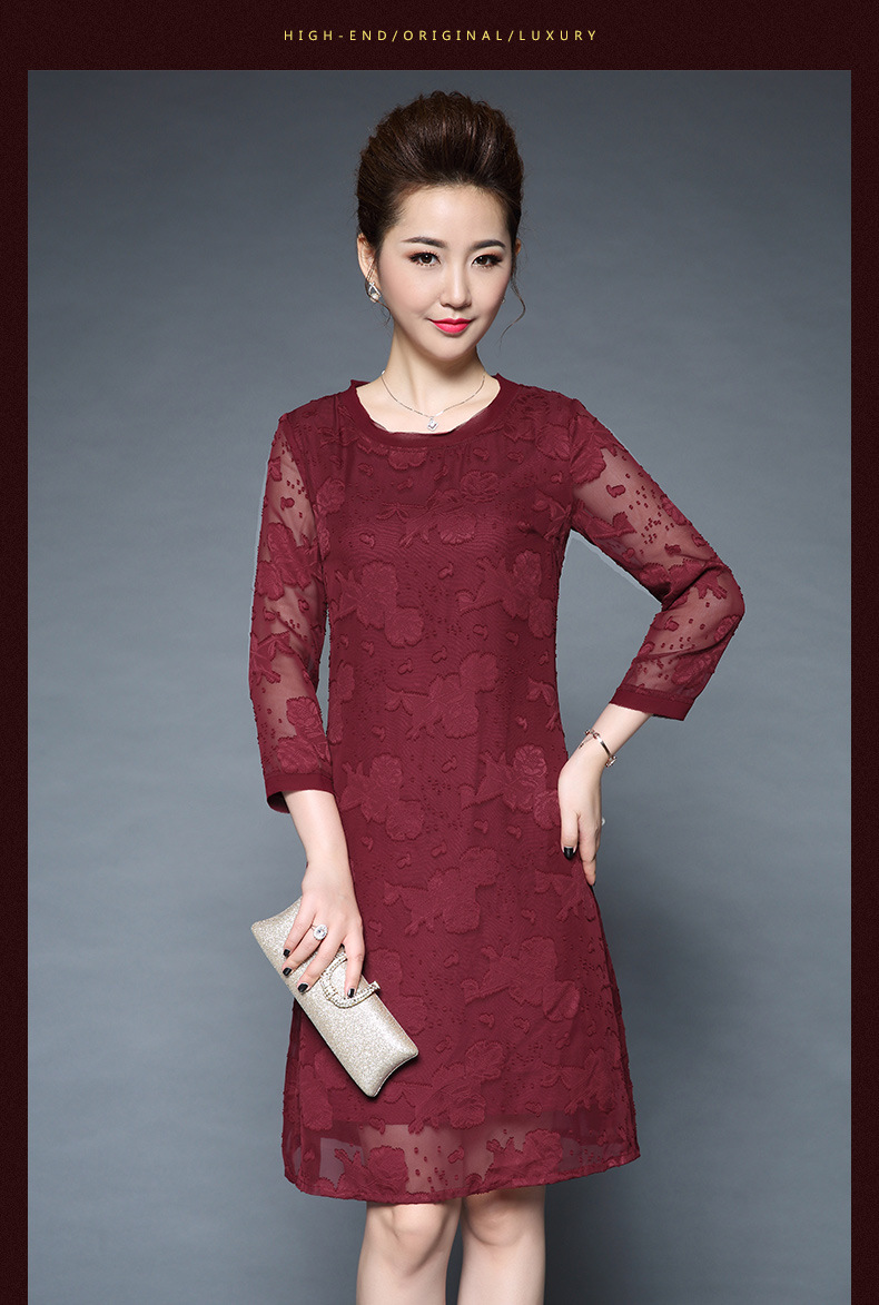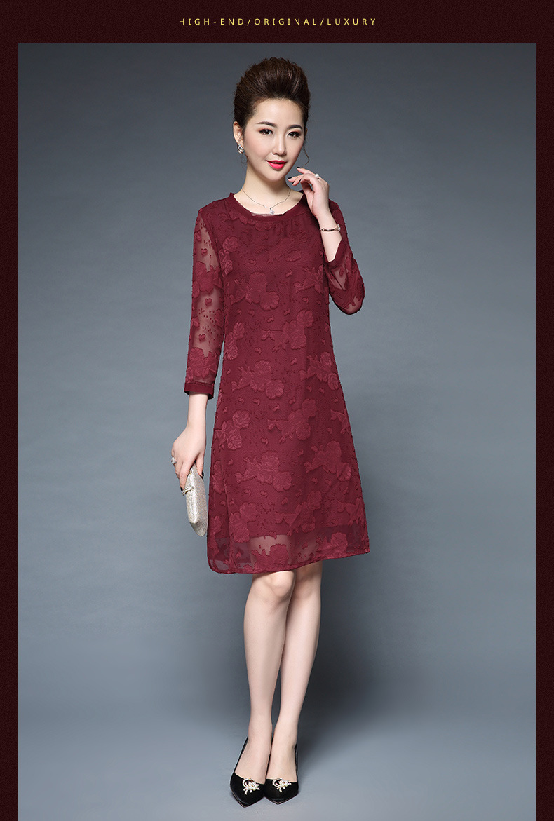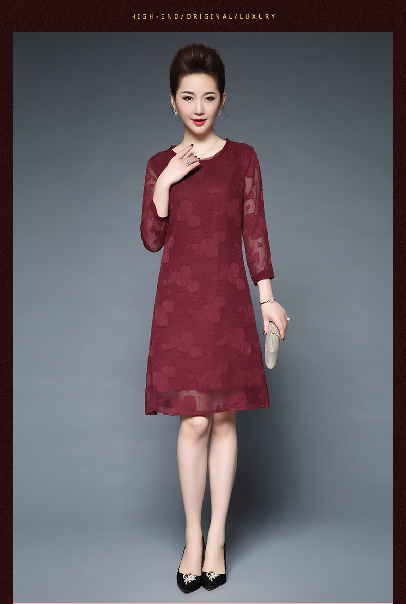 女装秋新品气质大码宽松妈妈装雪纺烧花七分袖连衣裙 批发 红色 M